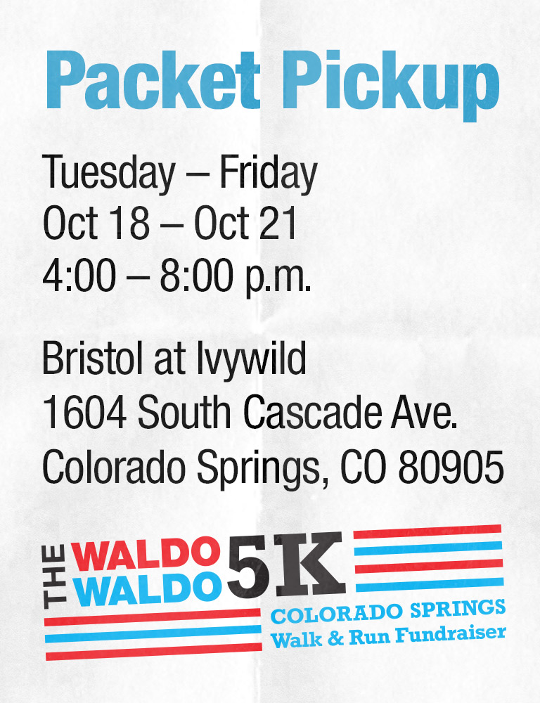 Free parking at the Antler's Hotel courtesy of Cushman & Wakefield. Enter from Pikes Peak or Antler's Place, but NOT from Colorado Avenue. The entrance from Colorado is bank parking, and is not free. Please write "Waldo Waldo 5K" on your ticket and check out with the attendant to receive free parking.